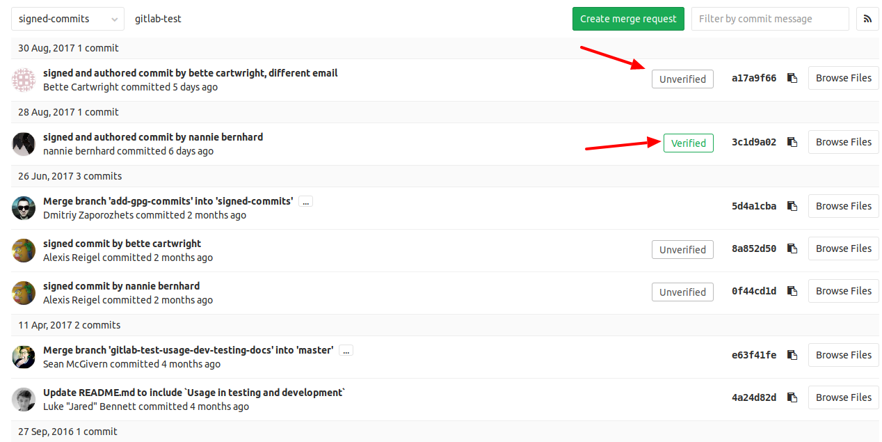 1. Within a project or merge request, navigate to the Commits tab. Signed commits will show a badge containing either "Verified" or "Unverified", depending on the verification status of the GPG signature.